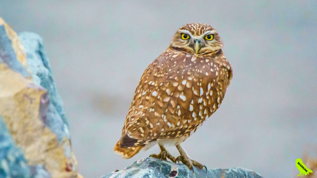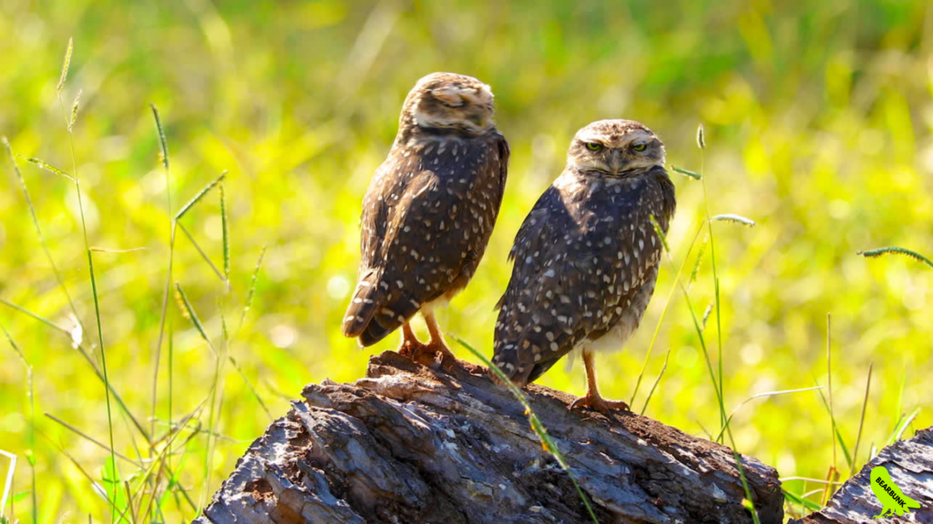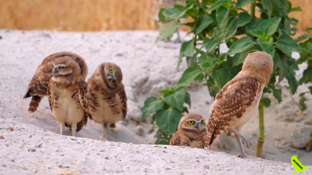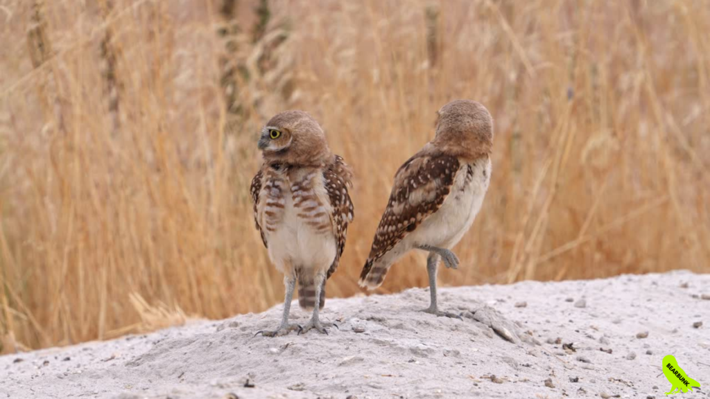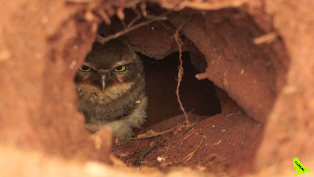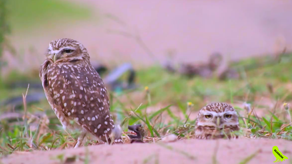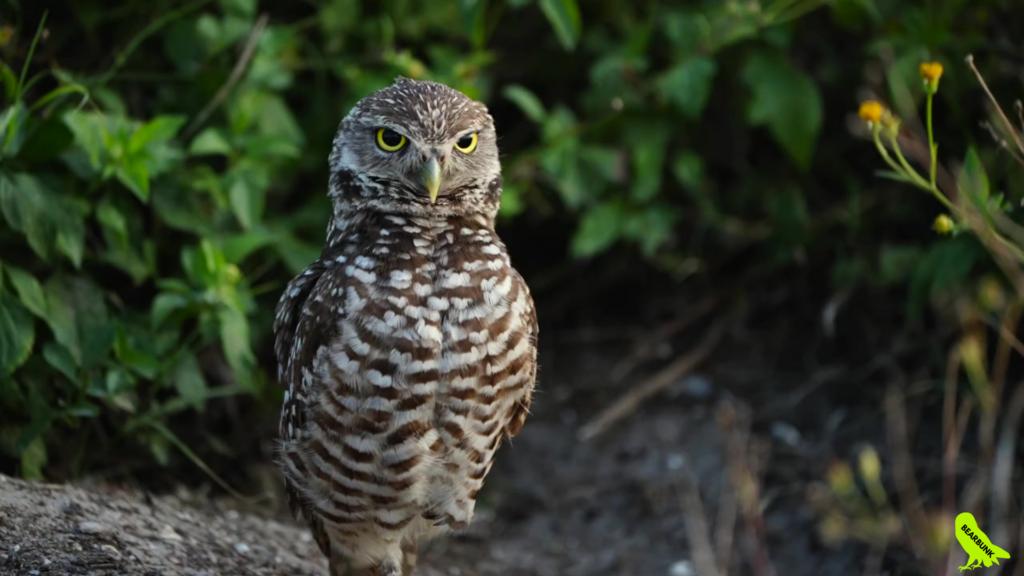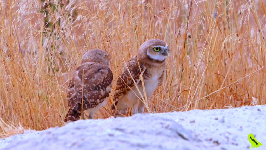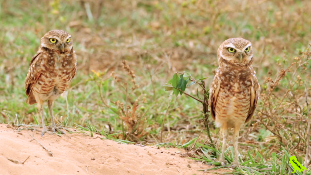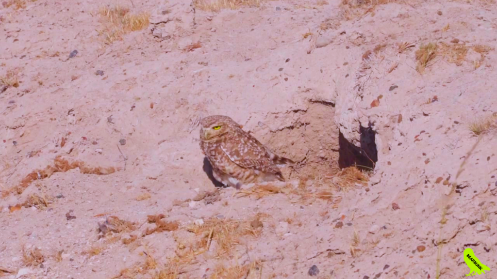 Burrowing owl standing at the entrance of its underground burrow with bright yellow eyes while another owl peeks from the tunnel behind it.