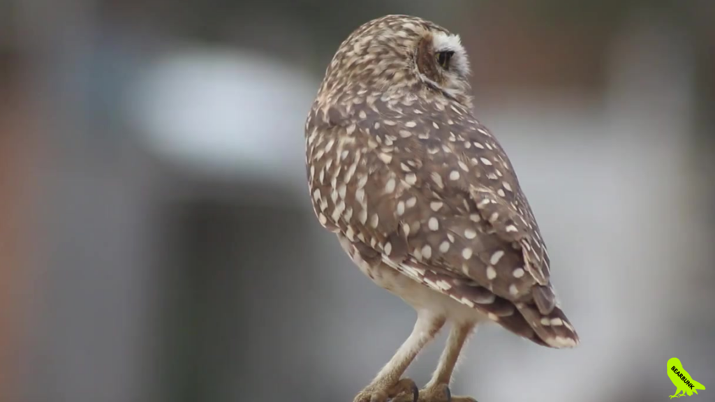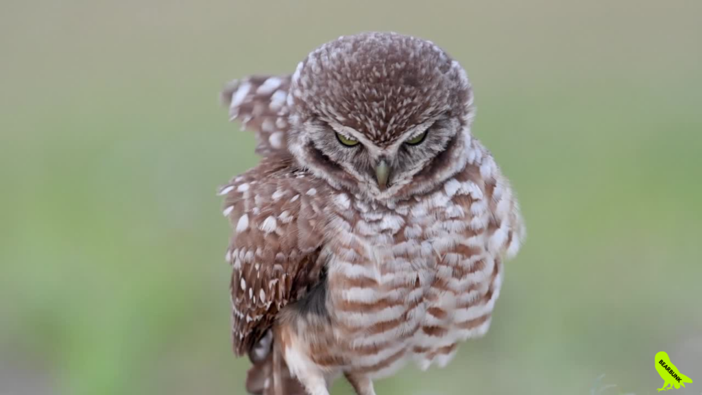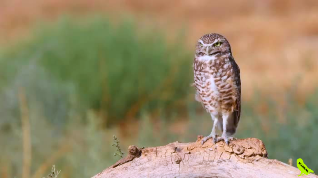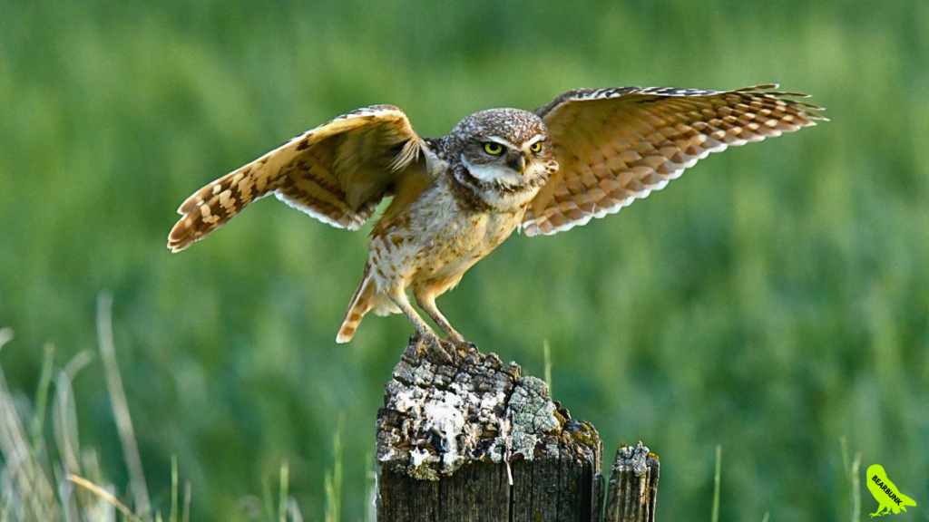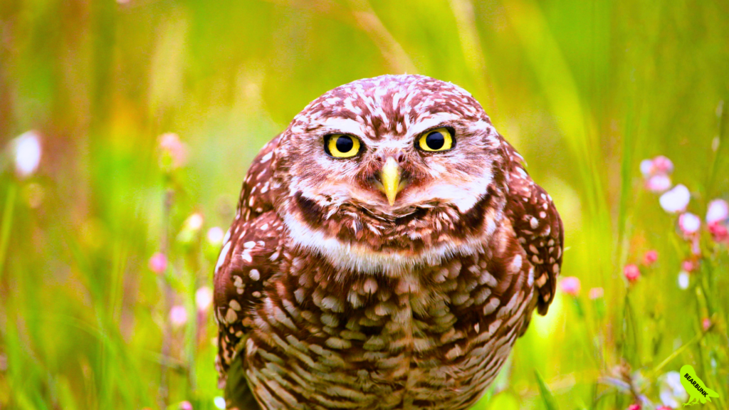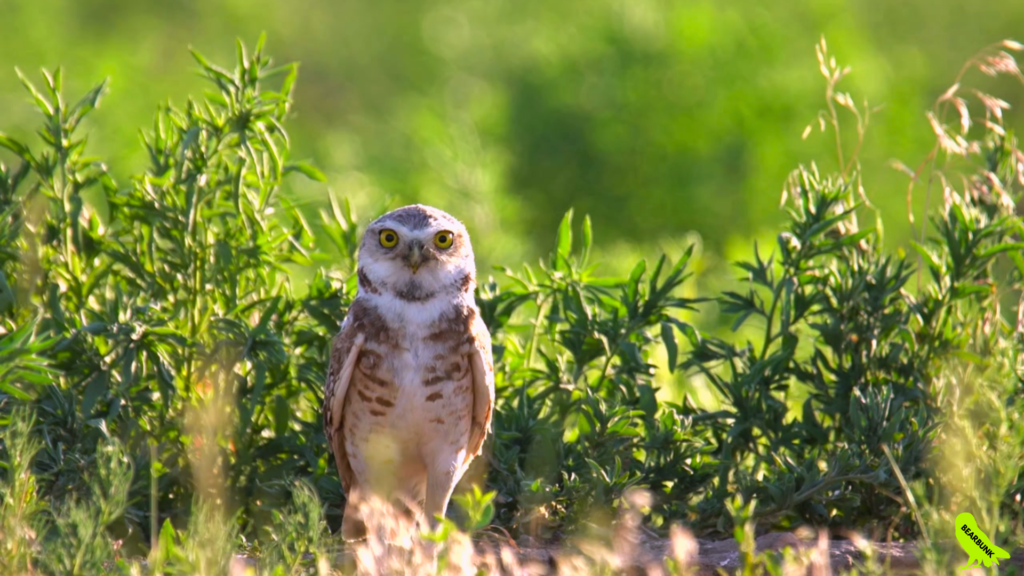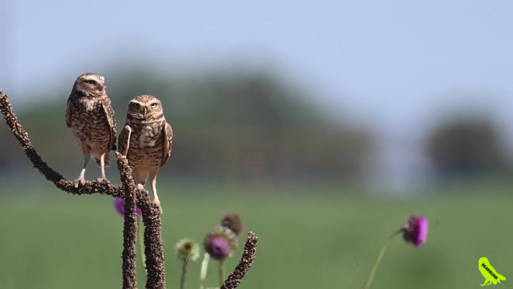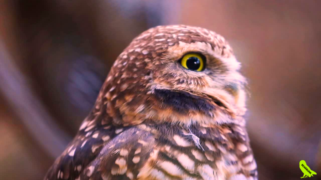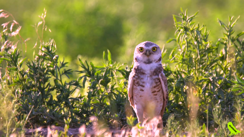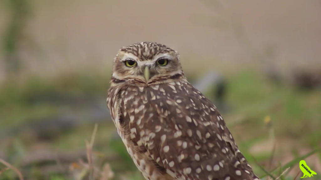 Burrowing owl standing at the entrance of its underground burrow with bright yellow eyes while another owl peeks from the tunnel behind it.