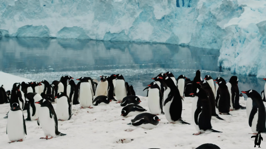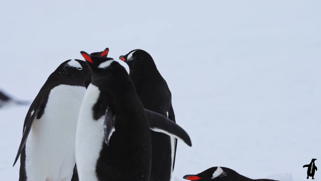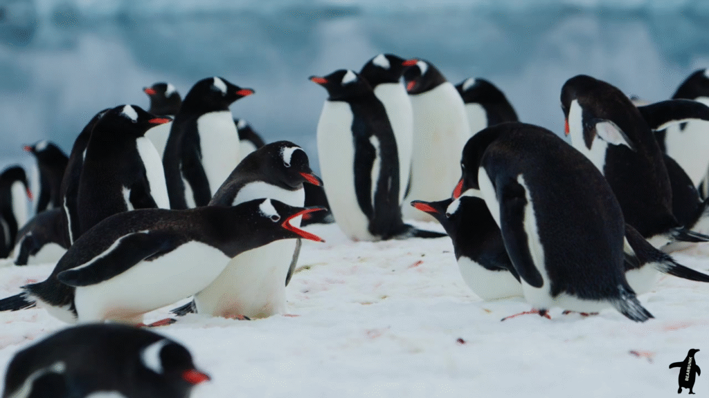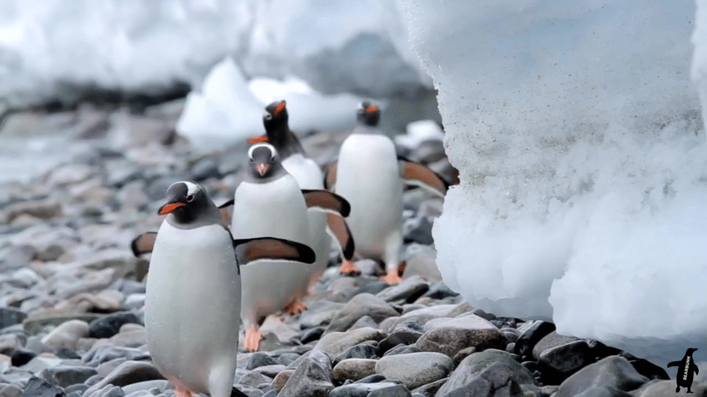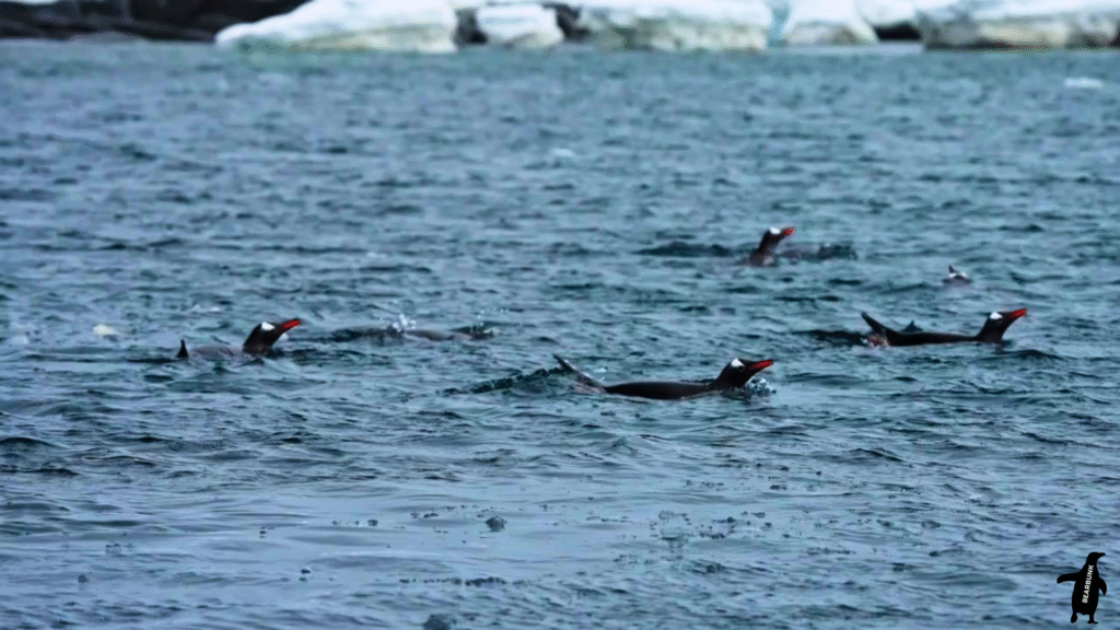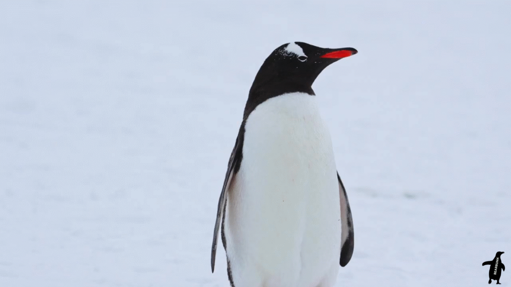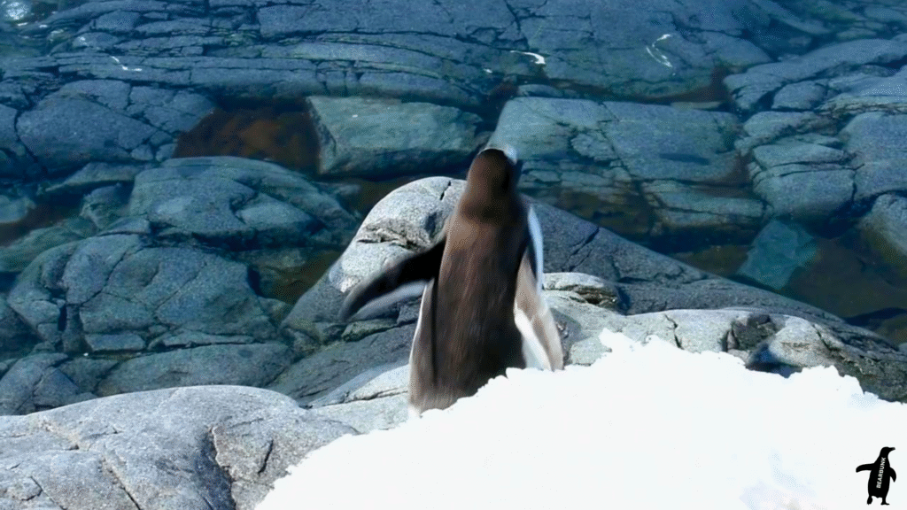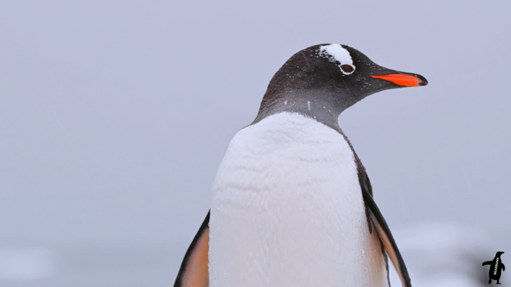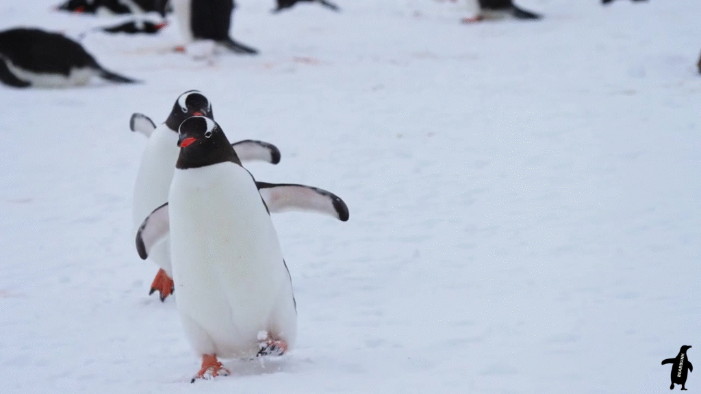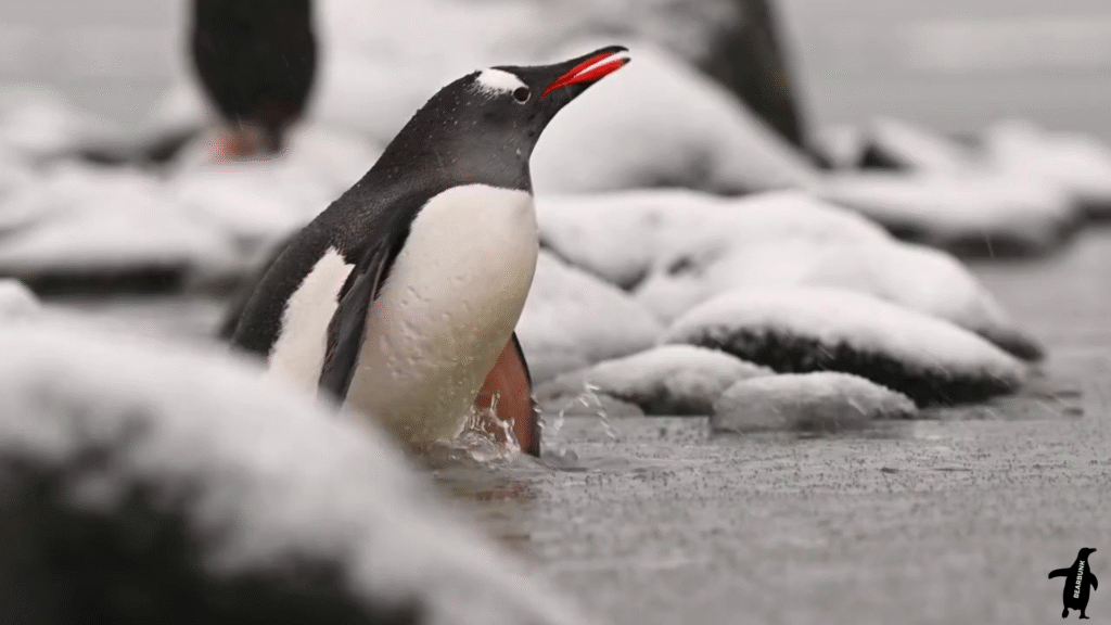 Gentoo penguin sliding on snow with its beak open, shown against a bright Antarctic background with text overlay reading “The Amazing Gentoo Penguin – An Antarctic Speed Machine.”