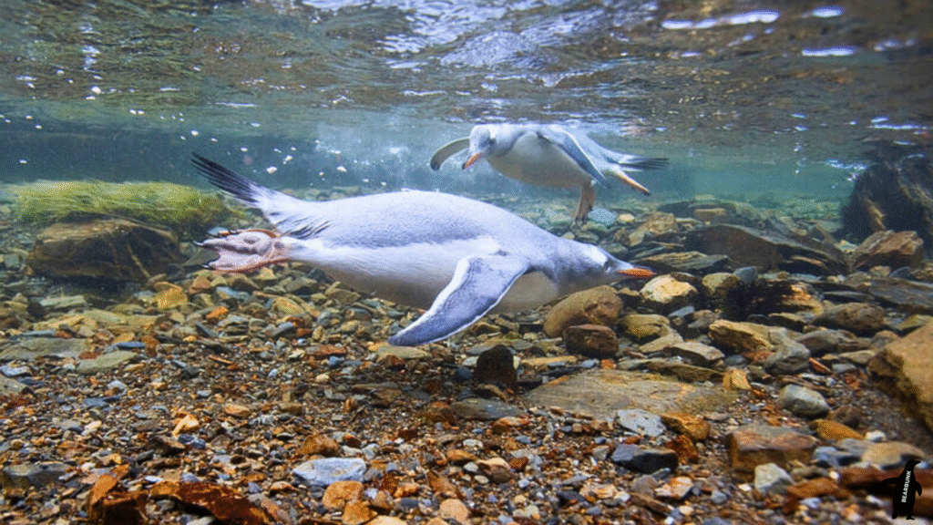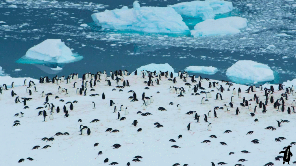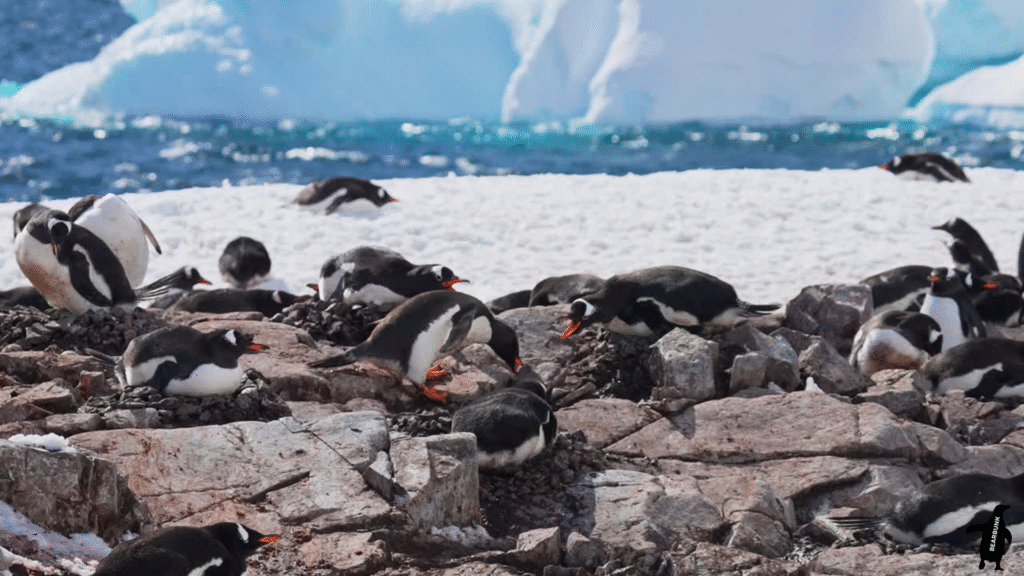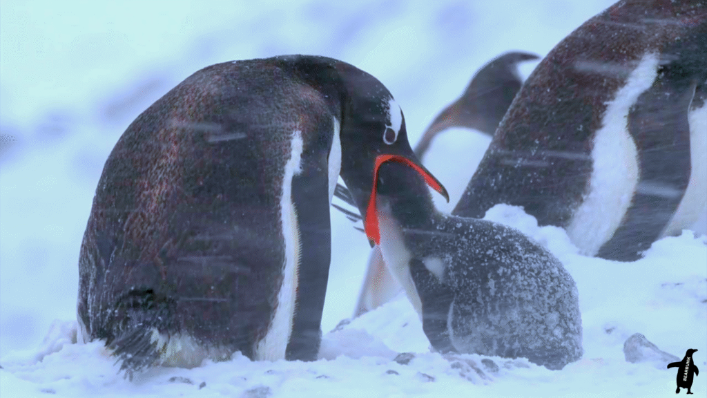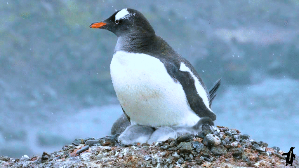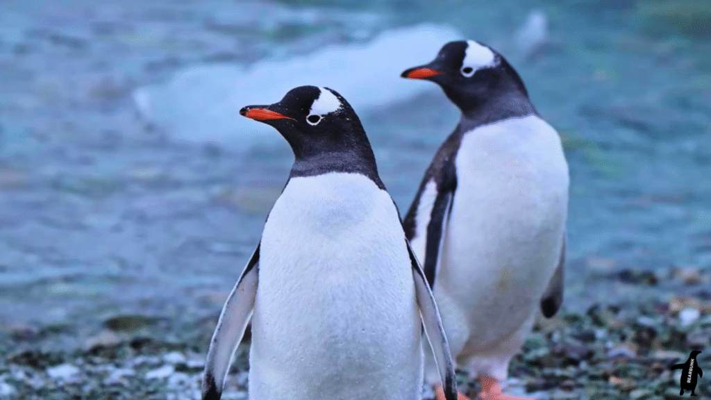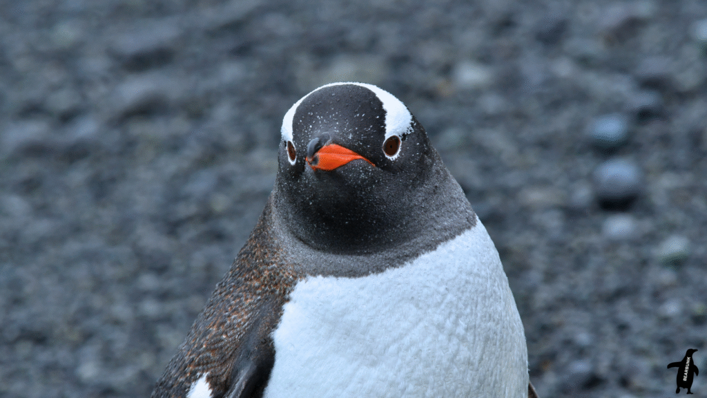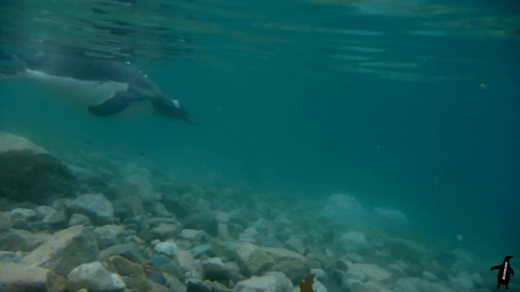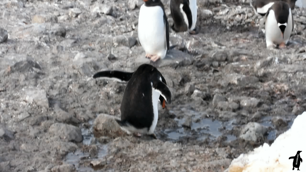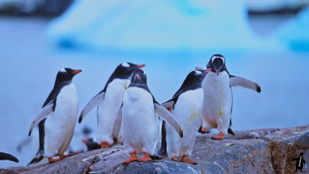 Gentoo penguin sliding on snow with its beak open, shown against a bright Antarctic background with text overlay reading “The Amazing Gentoo Penguin – An Antarctic Speed Machine.”