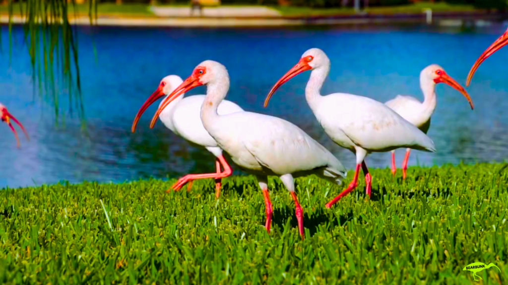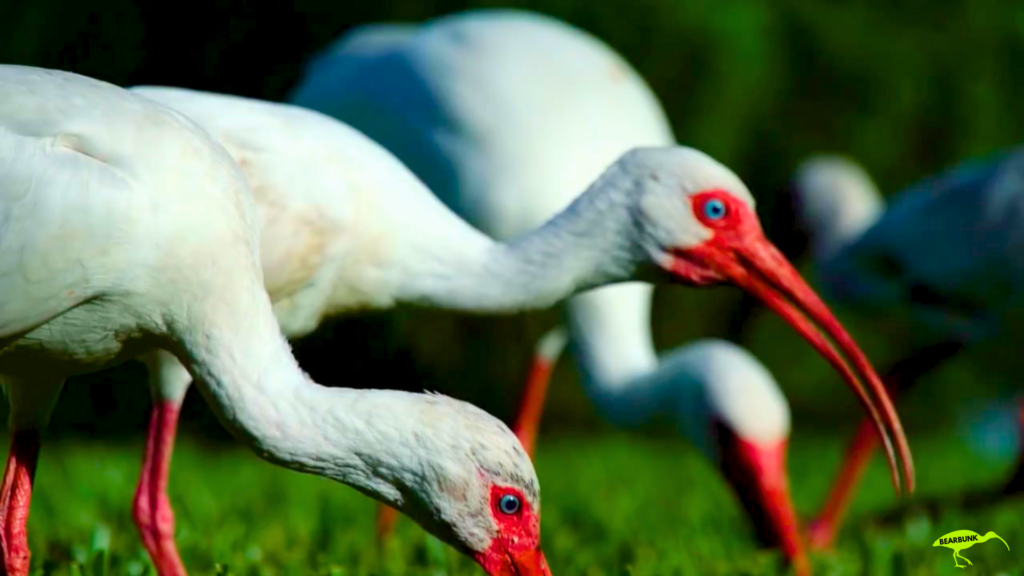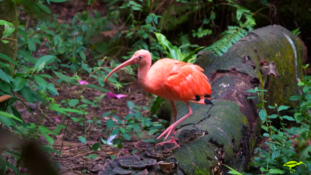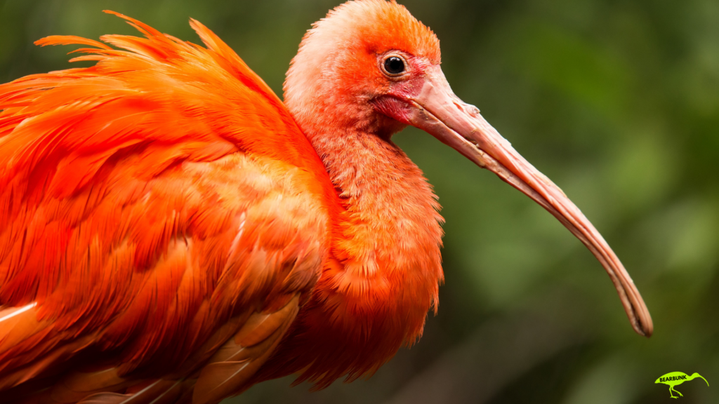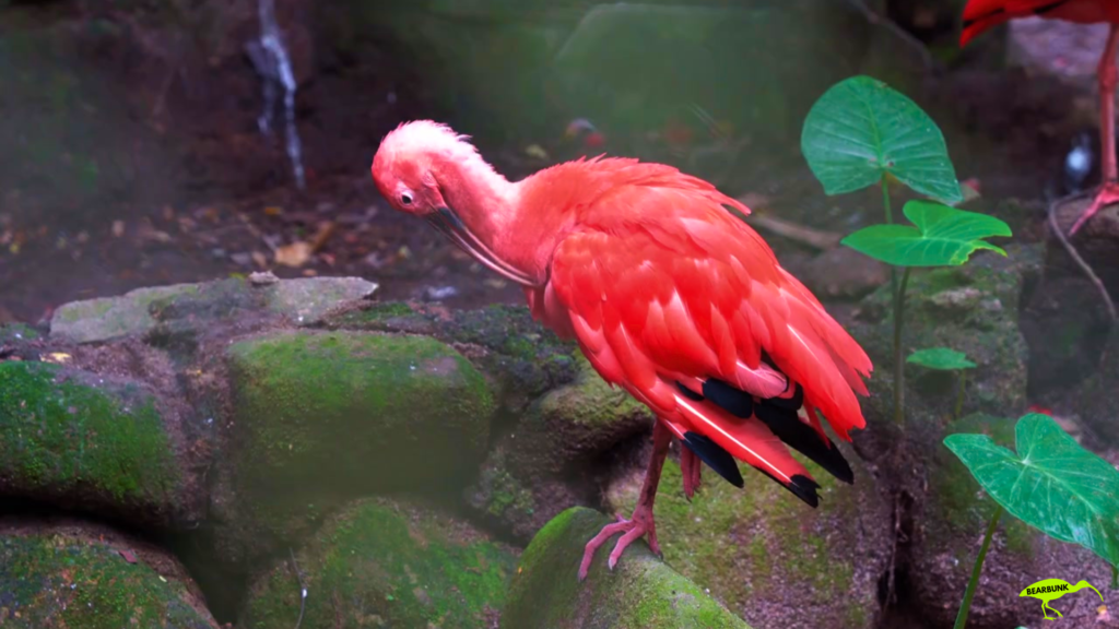 Scarlet ibis with bright red feathers and a long curved beak standing near water in a wetland setting.