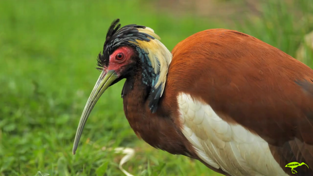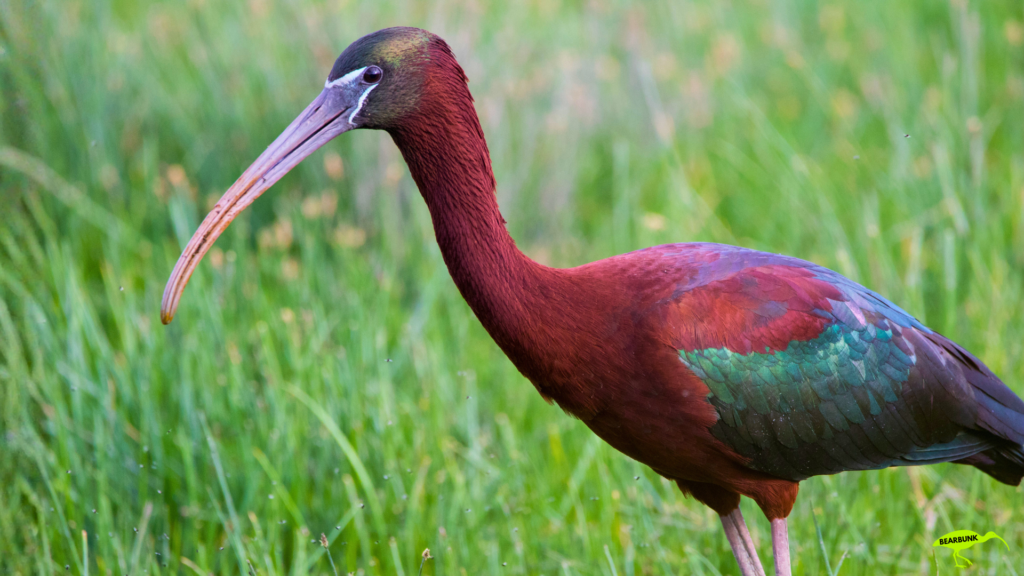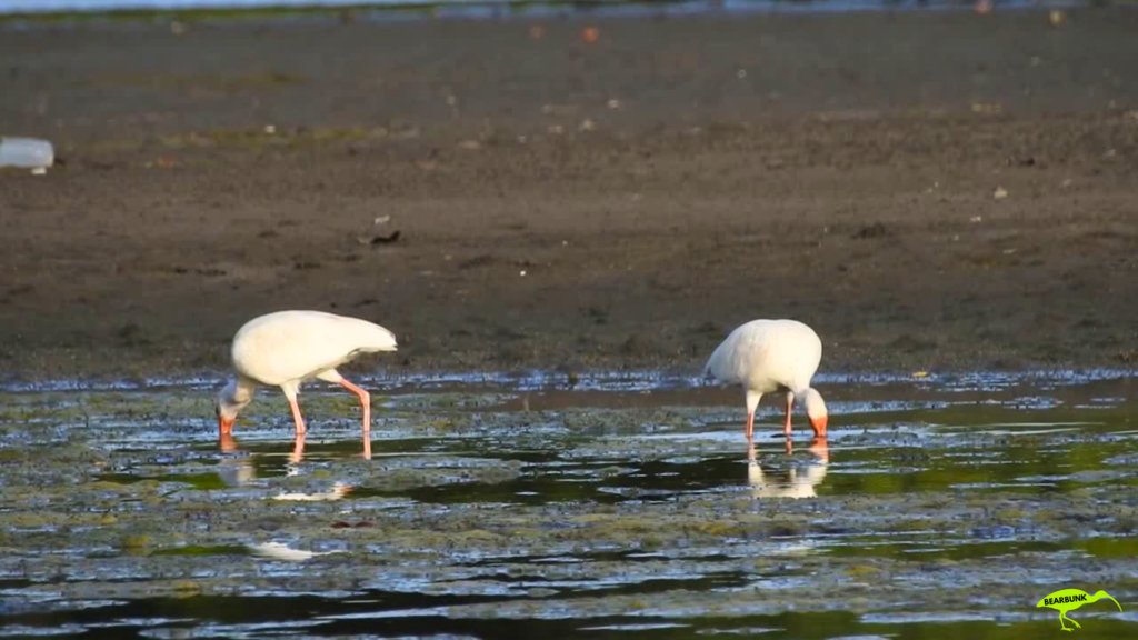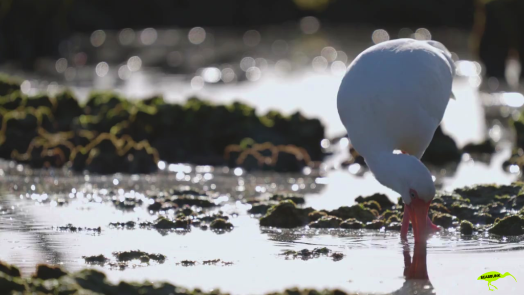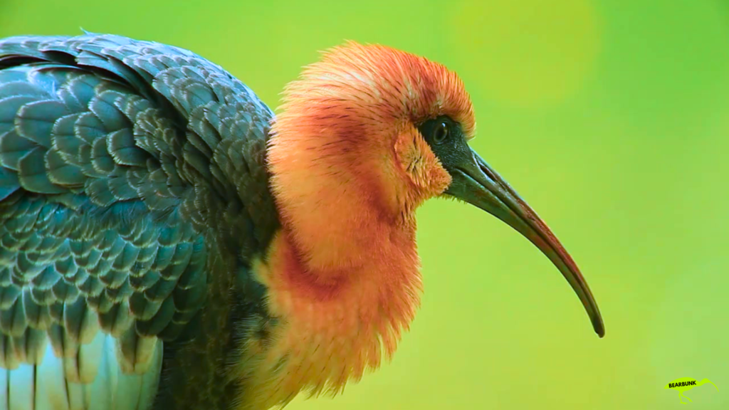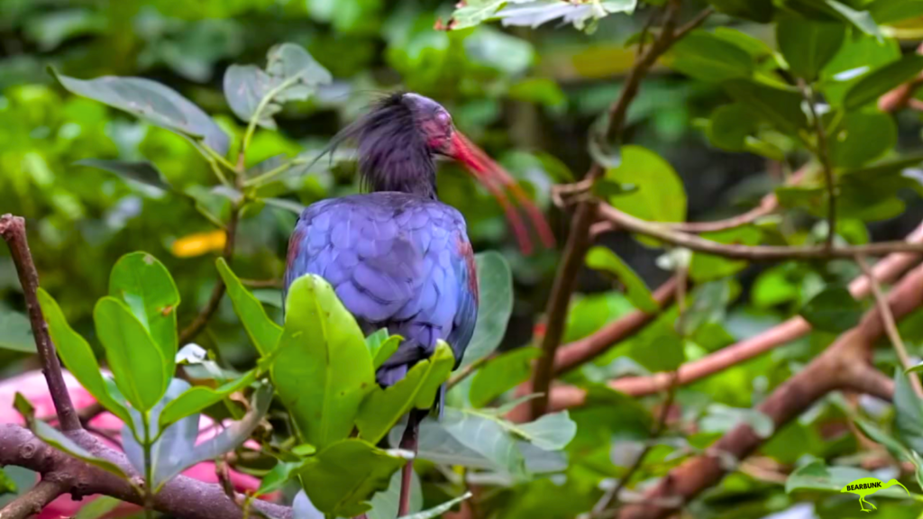 Scarlet ibis with bright red feathers and a long curved beak standing near water in a wetland setting.