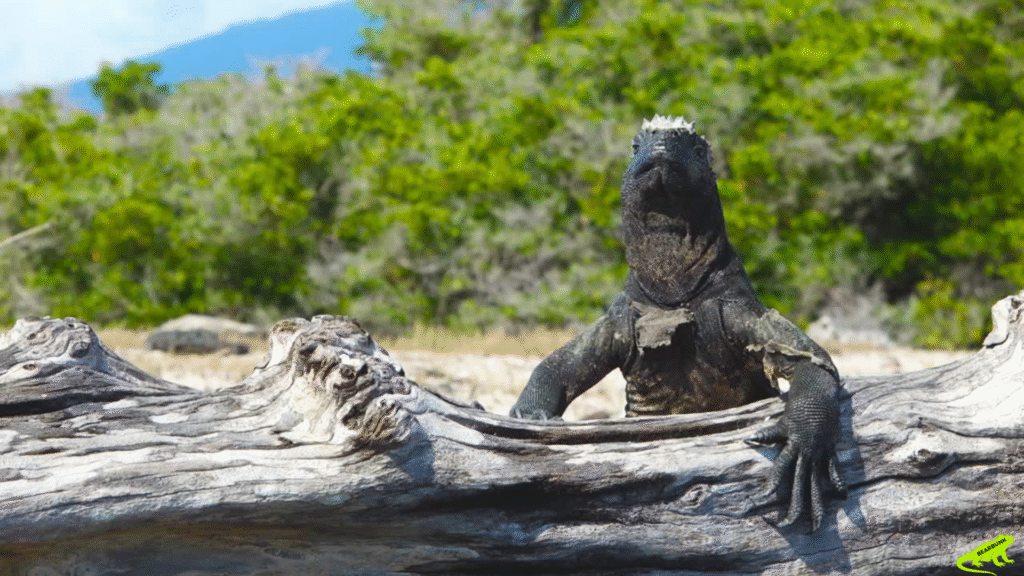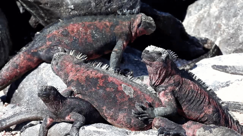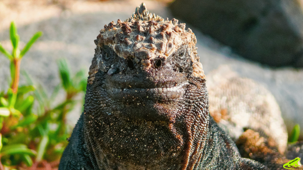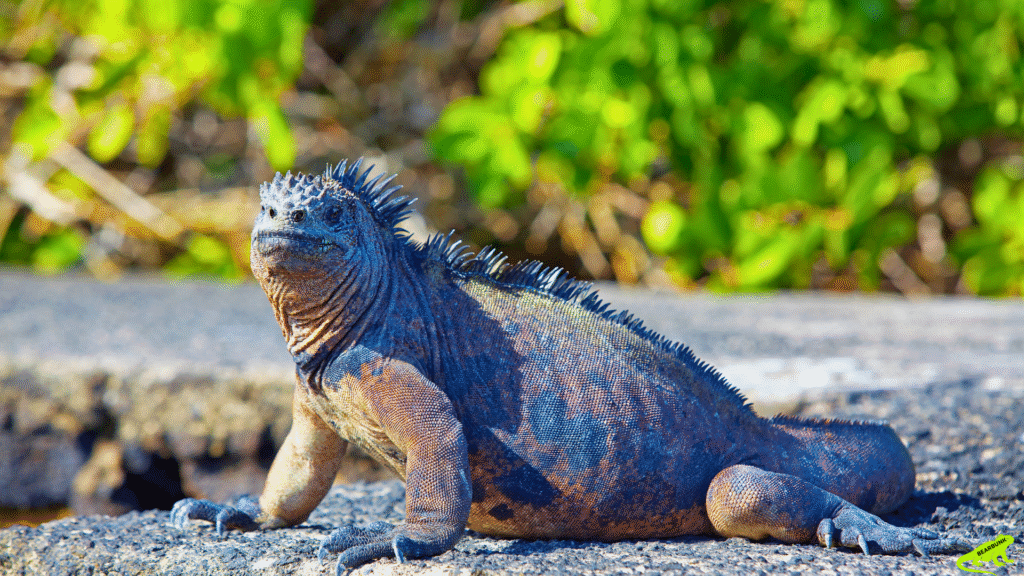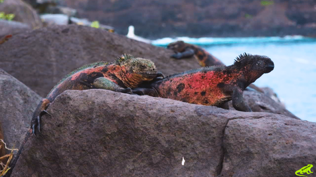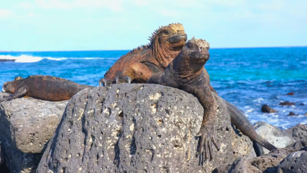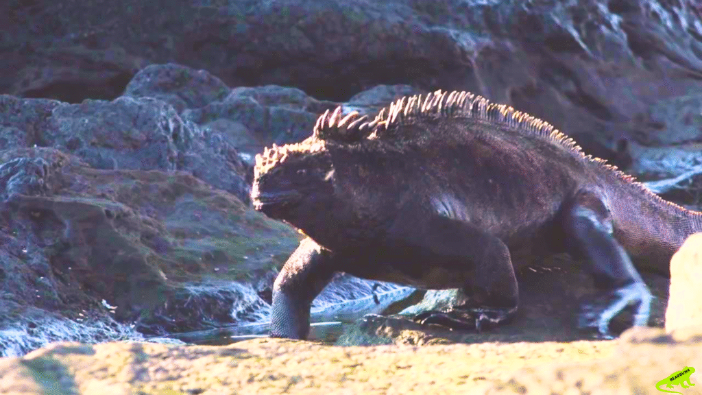 Marine iguana standing on black lava rock near the ocean in the Galápagos Islands, showing spines and rugged prehistoric appearance.