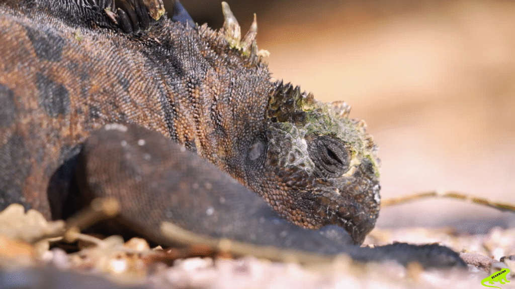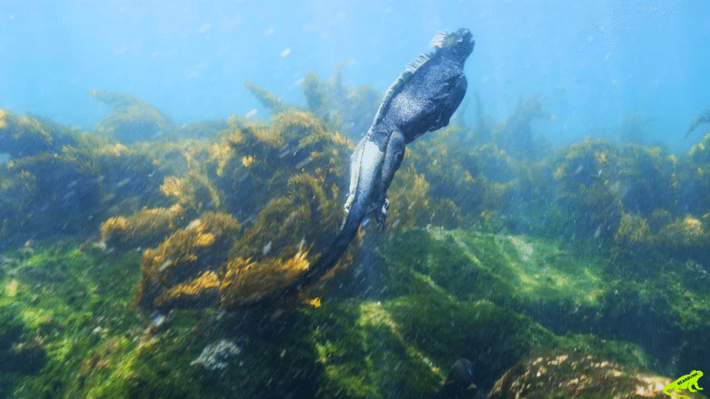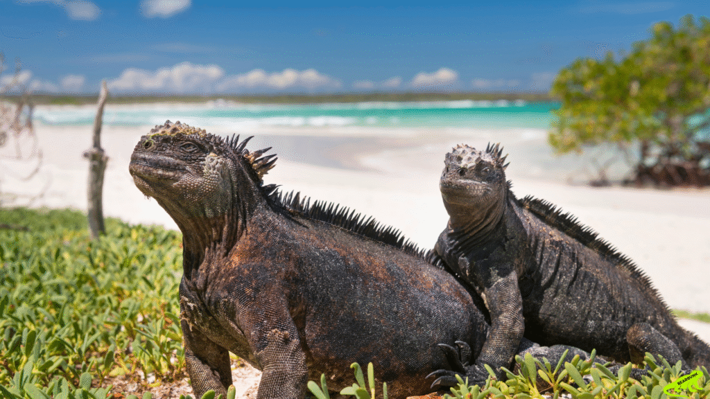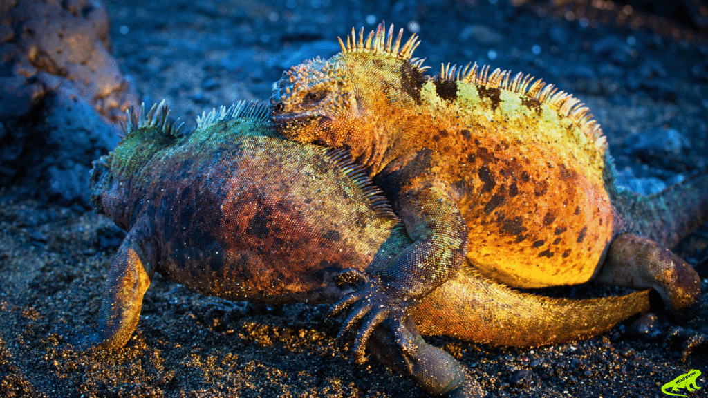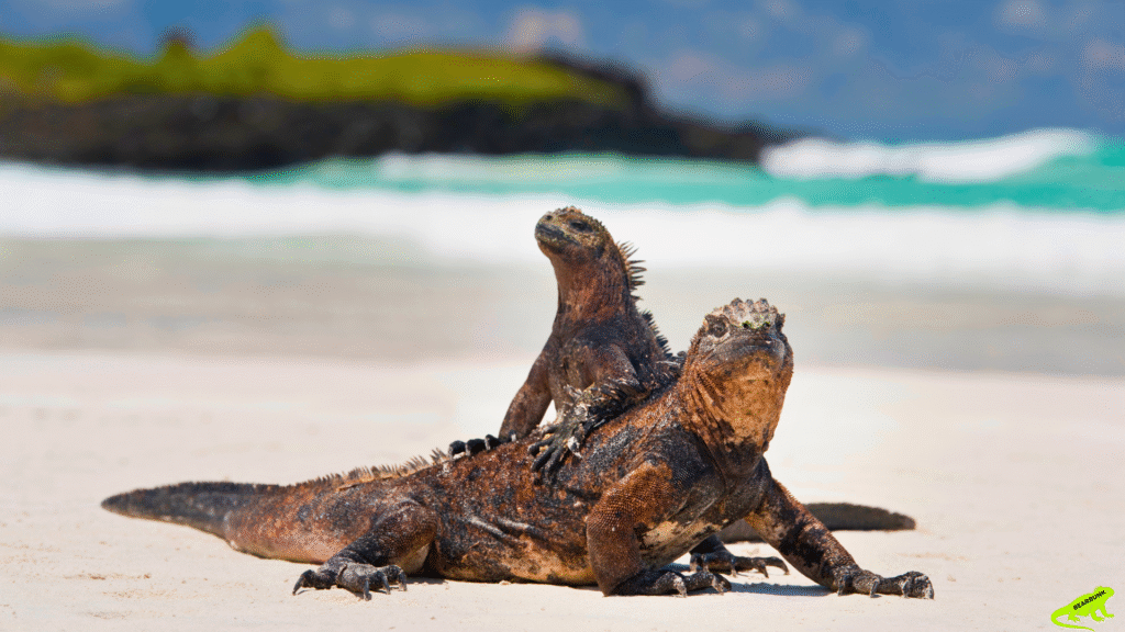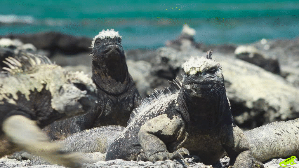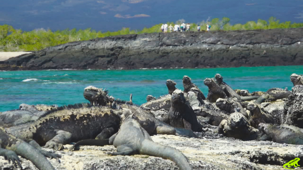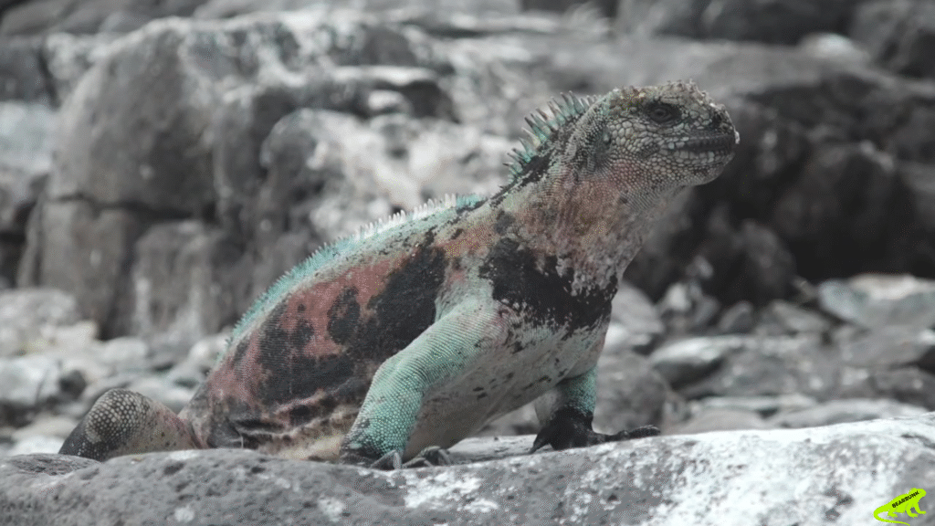 Marine iguana standing on black lava rock near the ocean in the Galápagos Islands, showing spines and rugged prehistoric appearance.