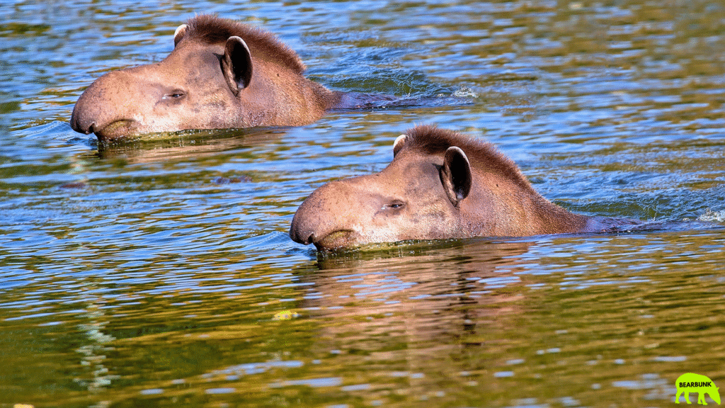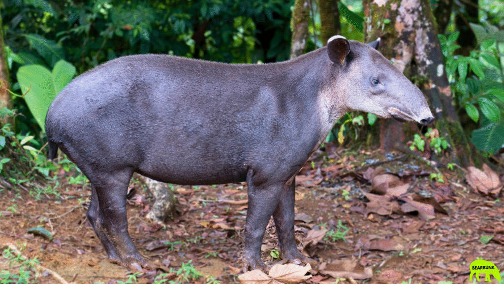 A tapir standing in a lush rainforest, showing its short trunk-like snout and rounded body — a gentle, ancient herbivore known as the “gardener of the forest.”